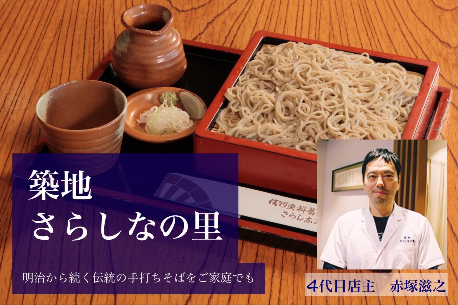 明治32年、初代赤塚善次郎が「築地さらしなの里」の前身となるそば屋を開業してから、120年以上が経った現在、4代目の滋行が受け継がれる名跡と歴史を守り、時代に合わせた工夫を施しながら、お客様に喜んでいただけるそば作りに精進しております。